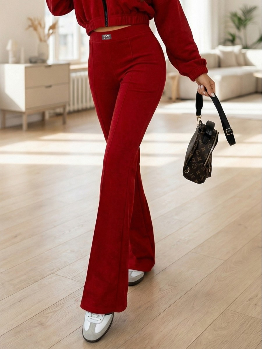 Una felpa ampia e pantaloni a zampa con cuciture decorative creano un outfit elegante e femminile, perfetto per tutti i giorni.