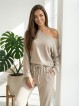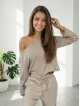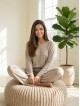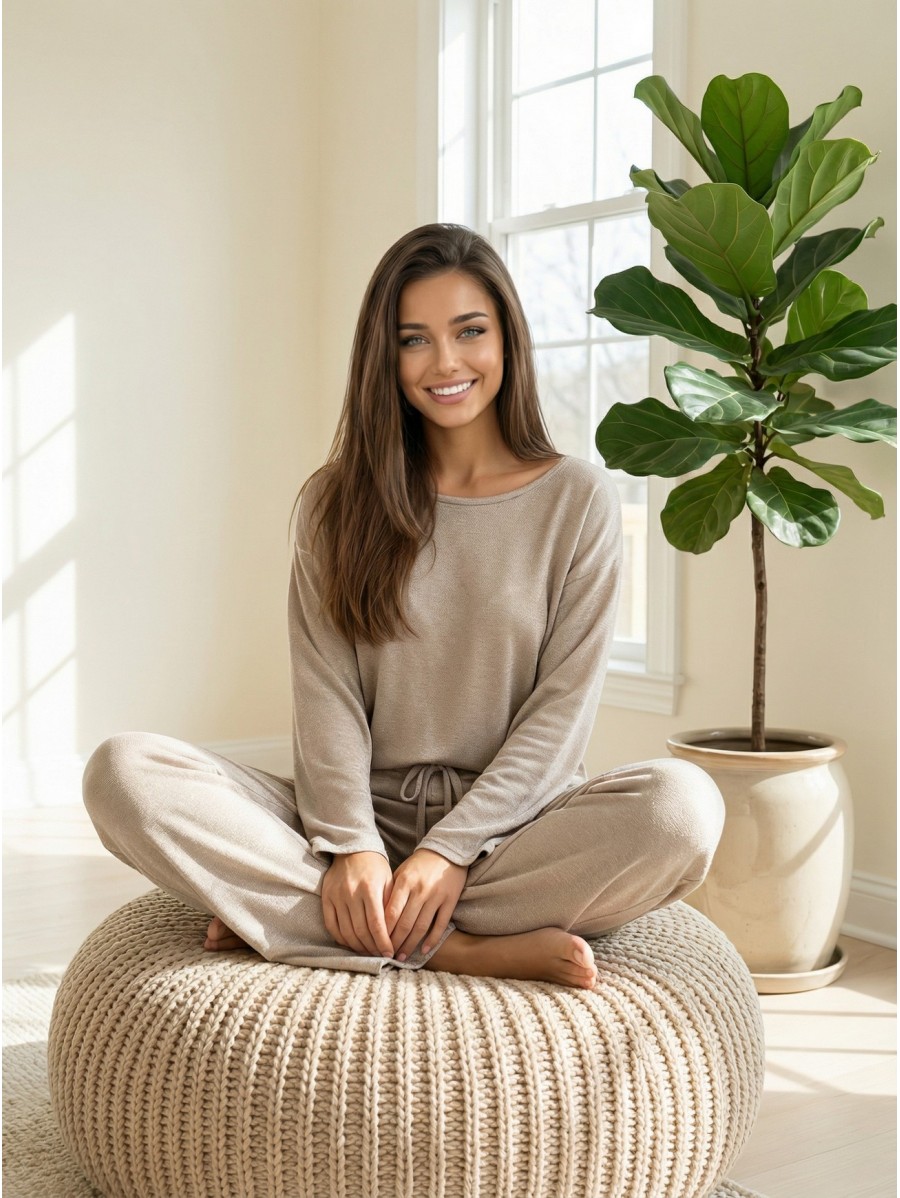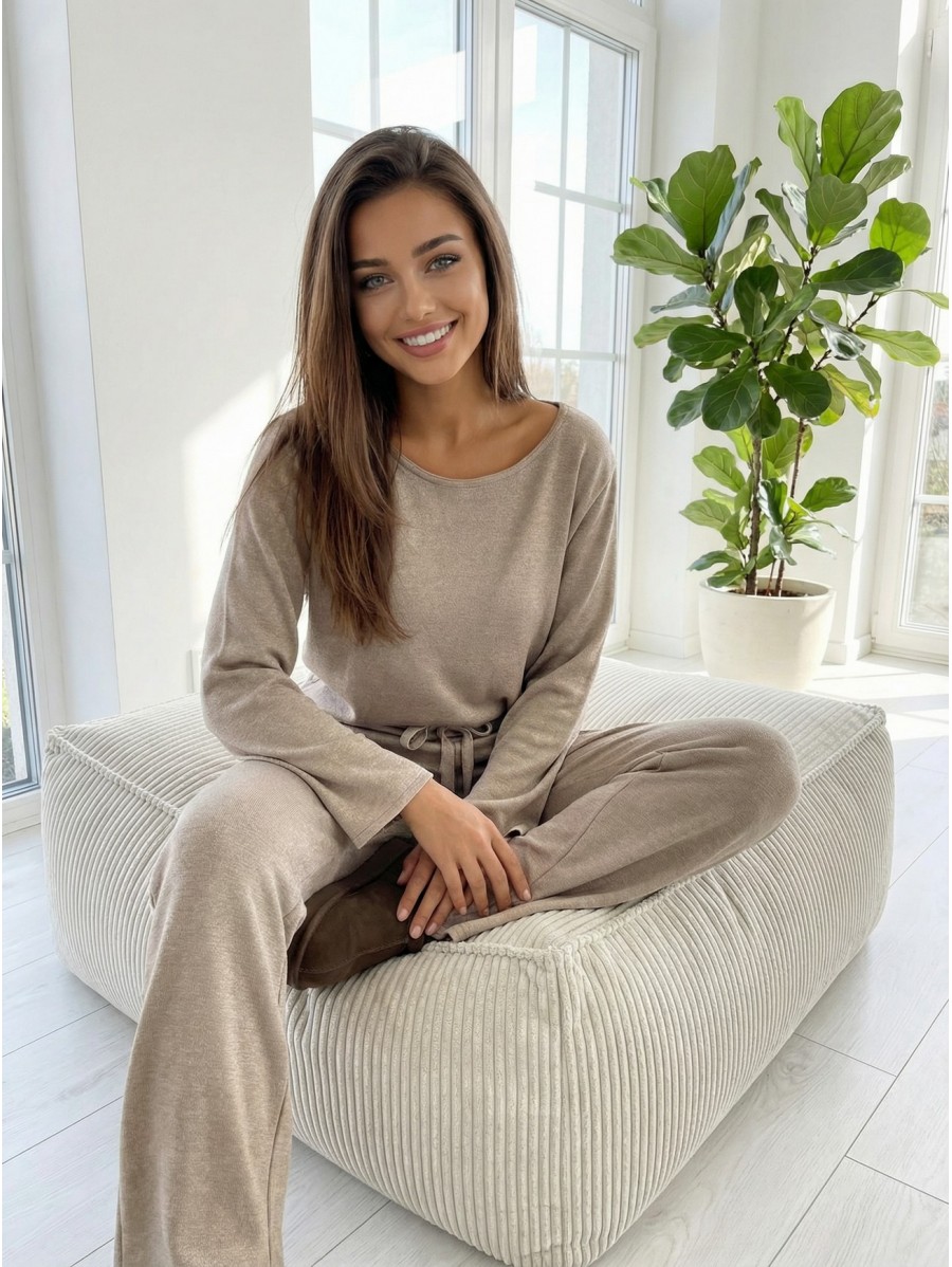La maglia dal taglio ampio con spalla scoperta e i pantaloni con coulisse in vita creano un look femminile e raffinato, perfetto per le giornate più fresche in casa o per una passeggiata all’aperto.