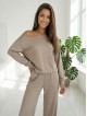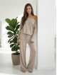 La maglia dal taglio morbido con spalla leggermente scoperta aggiunge un tocco elegante e femminile, mentre i pantaloni dritti con coulisse garantiscono una vestibilità comoda.