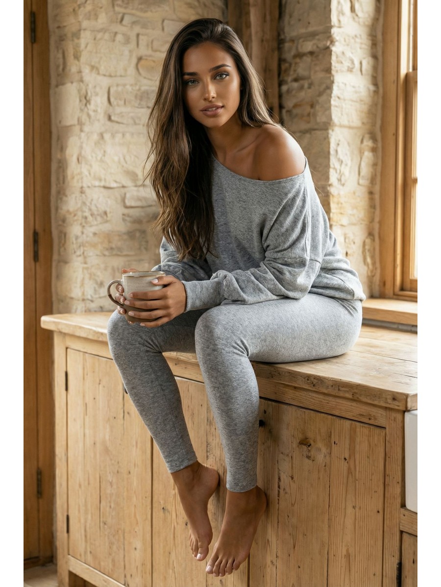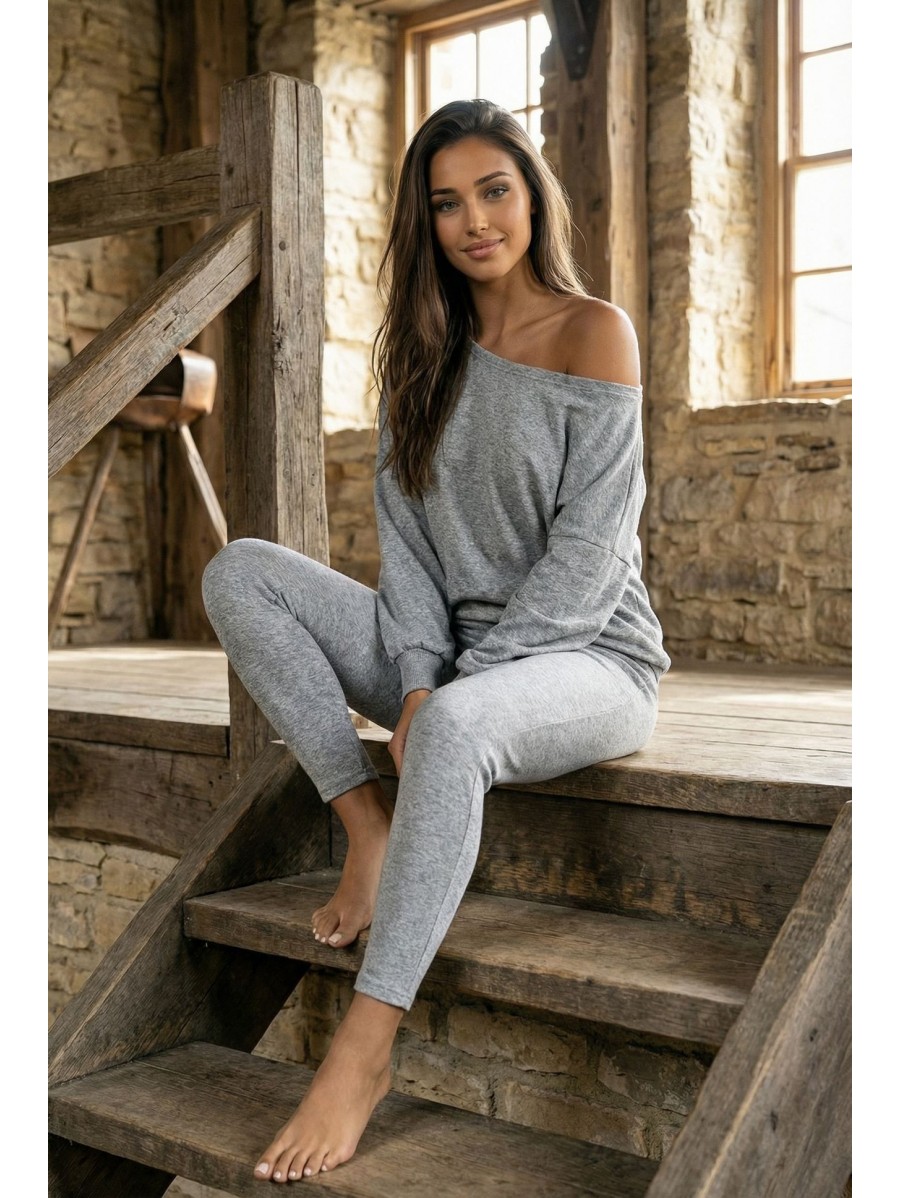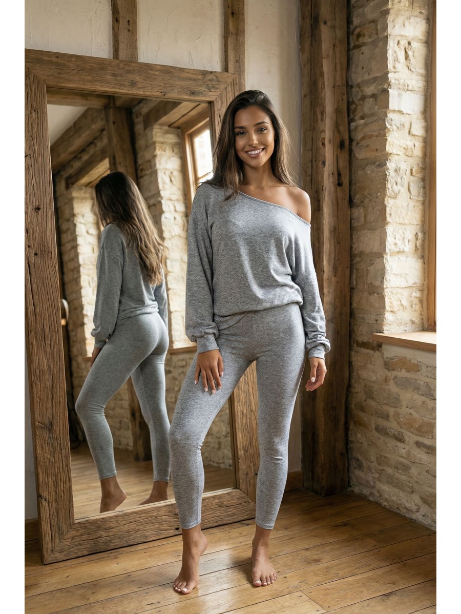 SOFT TOUCH K162 è un completo femminile realizzato in maglia elasticizzata, composto da un maglione dal taglio morbido con spalla scesa e leggings aderenti.