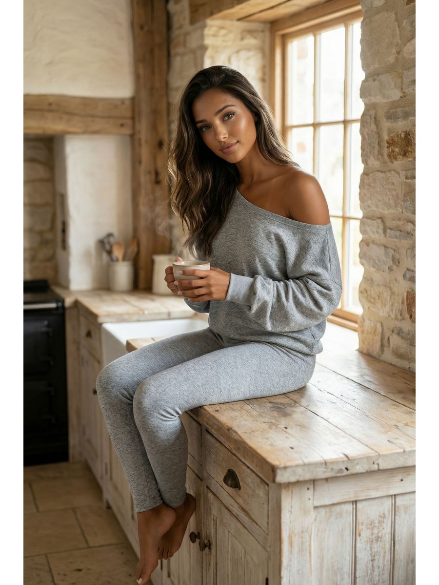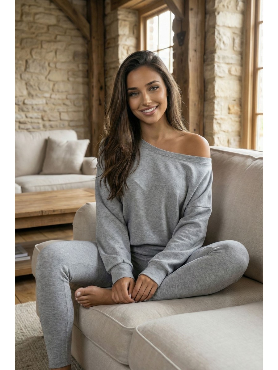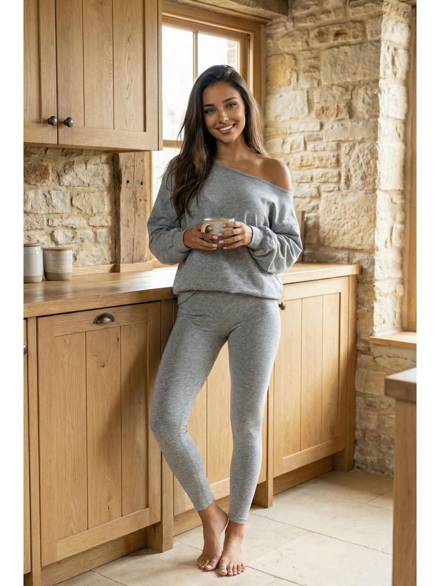 SOFT TOUCH K162 è un completo femminile realizzato in maglia elasticizzata, composto da un maglione dal taglio morbido con spalla scesa e leggings aderenti.