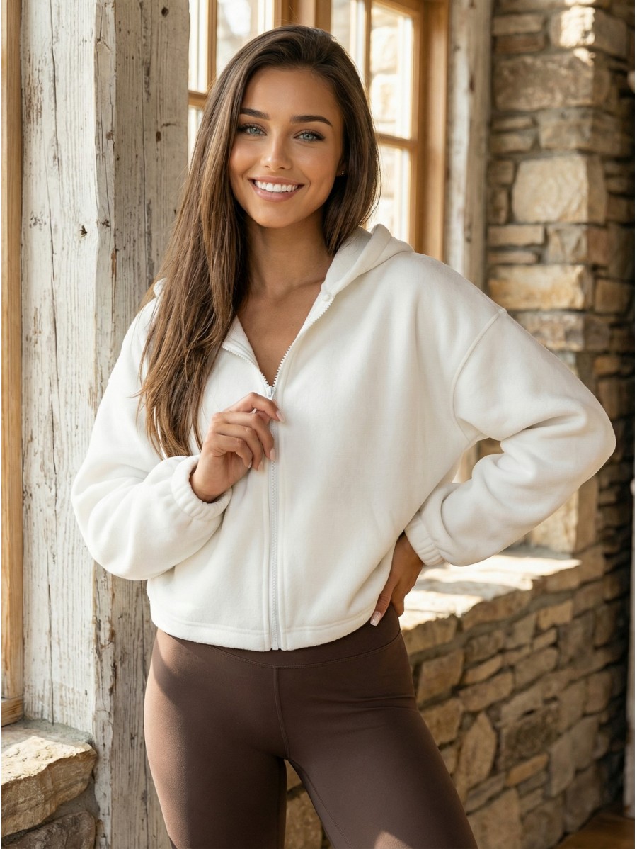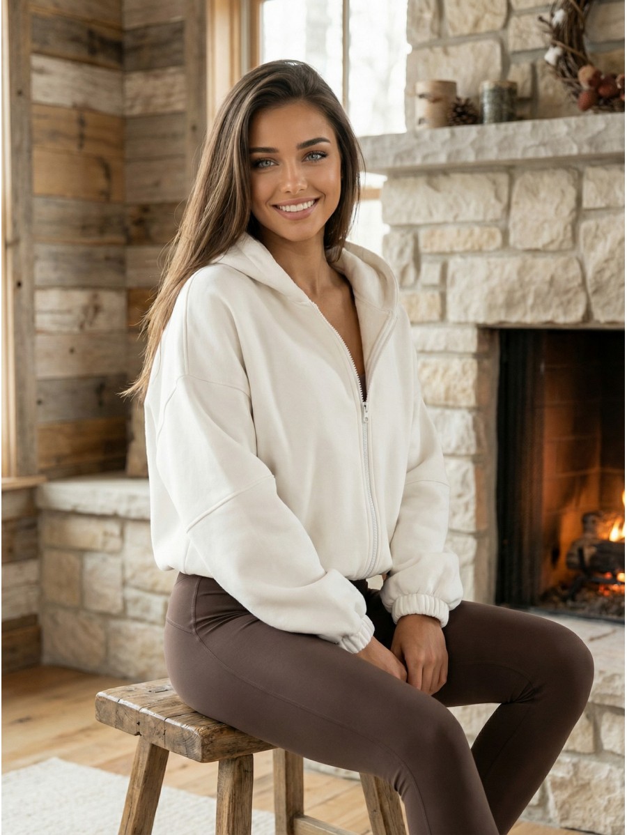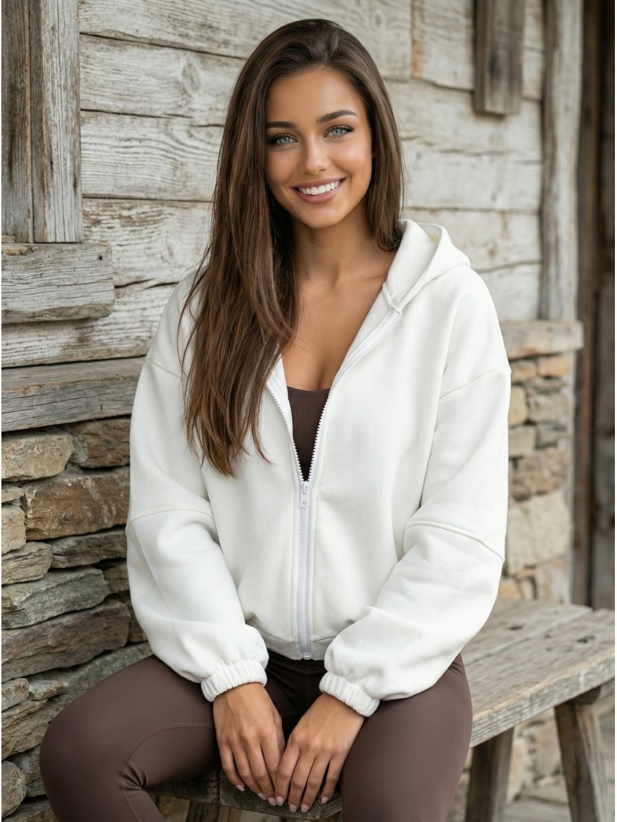 Il taglio oversize con spalle scese dona un’aria rilassata e contemporanea, mentre la zip a contrasto e il cappuccio aggiungono un tocco urbano e dinamico.