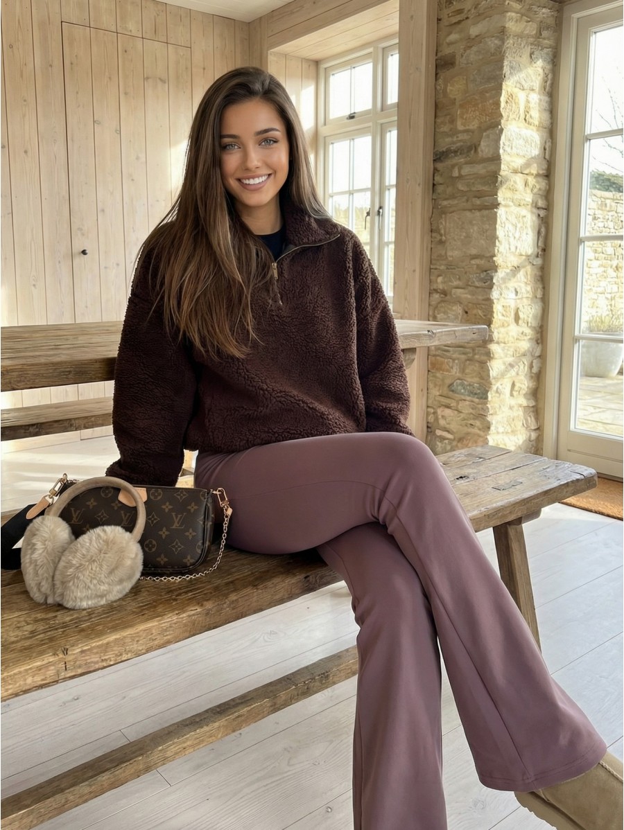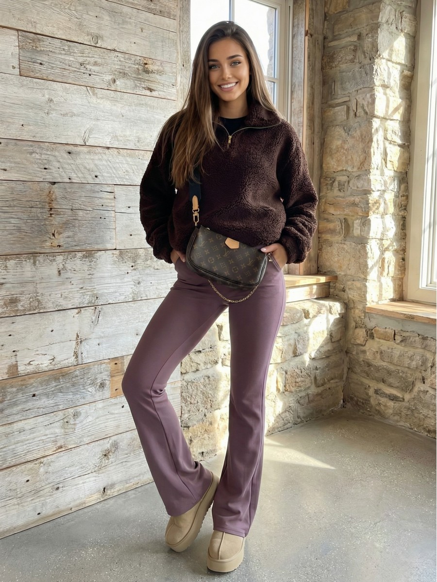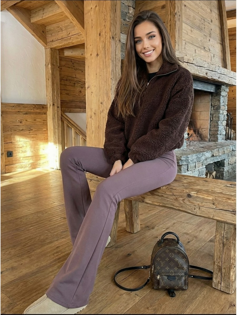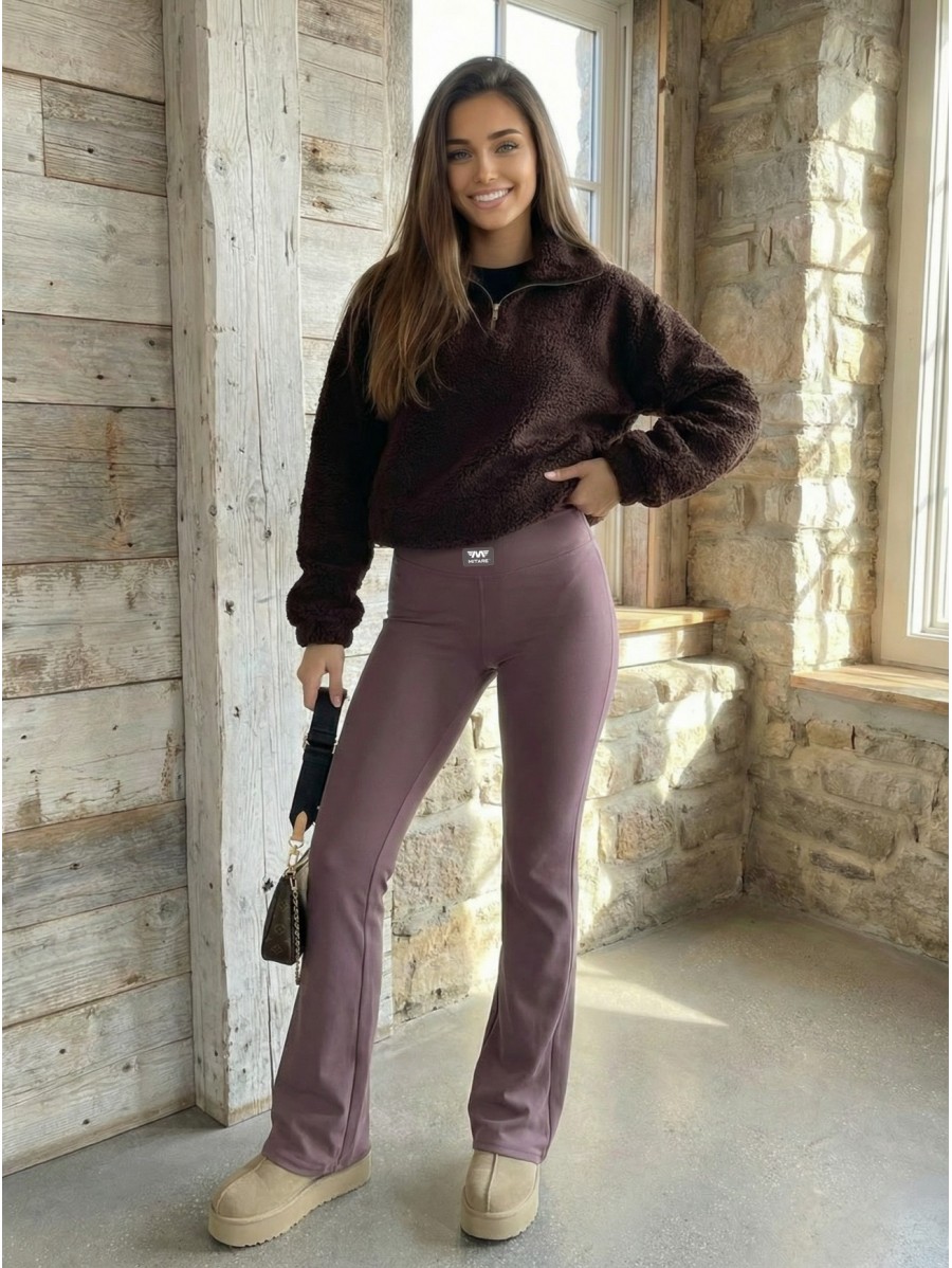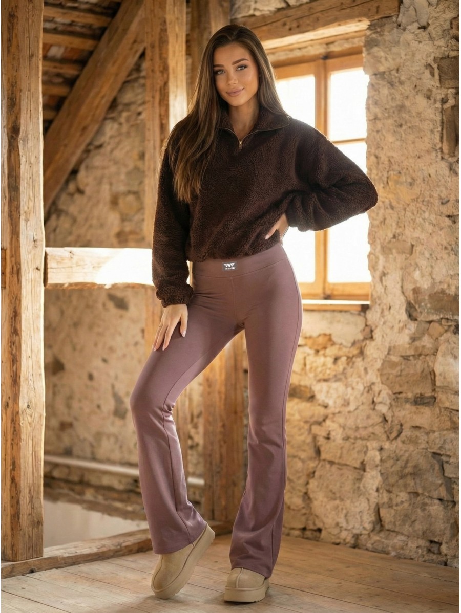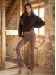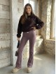 Il tessuto elasticizzato si adatta perfettamente al corpo, mentre la gamba svasata allunga otticamente la figura e valorizza le forme.